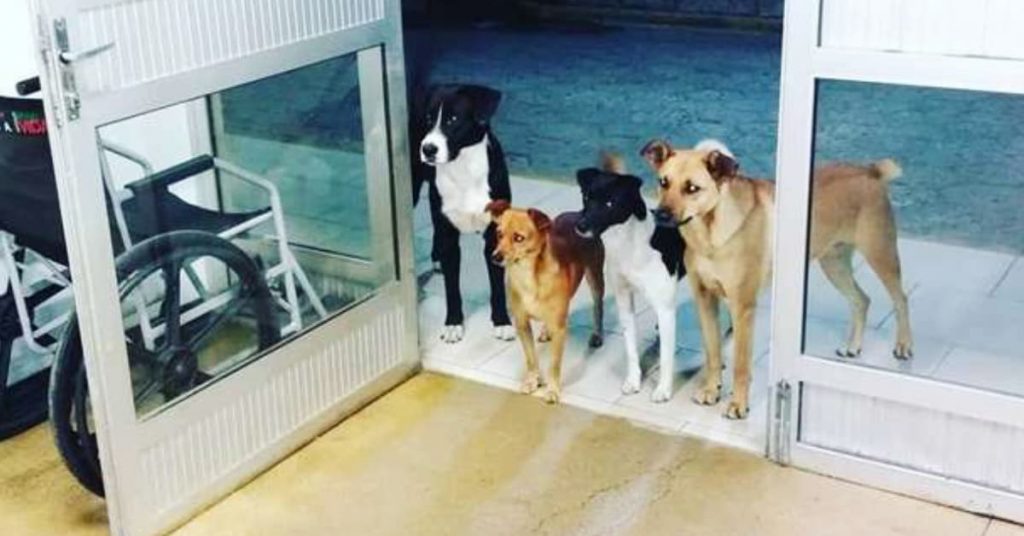 Cris Mamprim looked towards the entrance of the hospital. They noticed a group of very loyal canine companions standing by the doors.